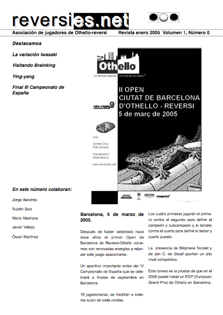 Durante unos años estuvimos editando una revista con artículos, ejercicios, análisis sobre partidas, torneos y todo lo referente al mundo de othello.